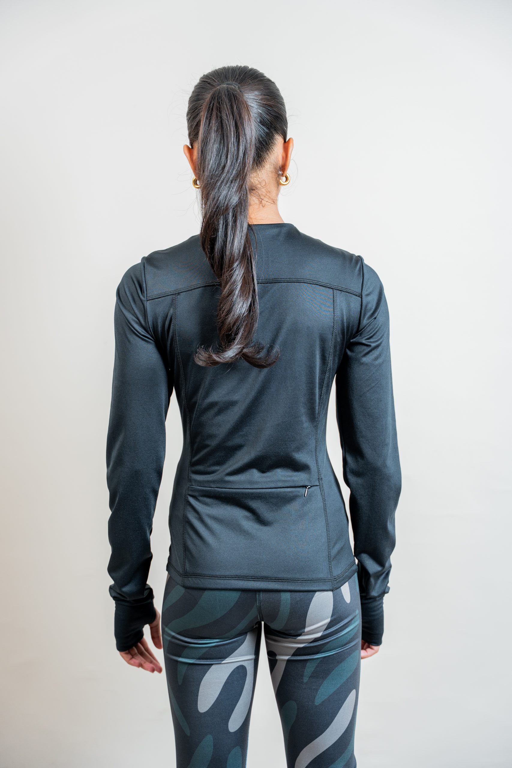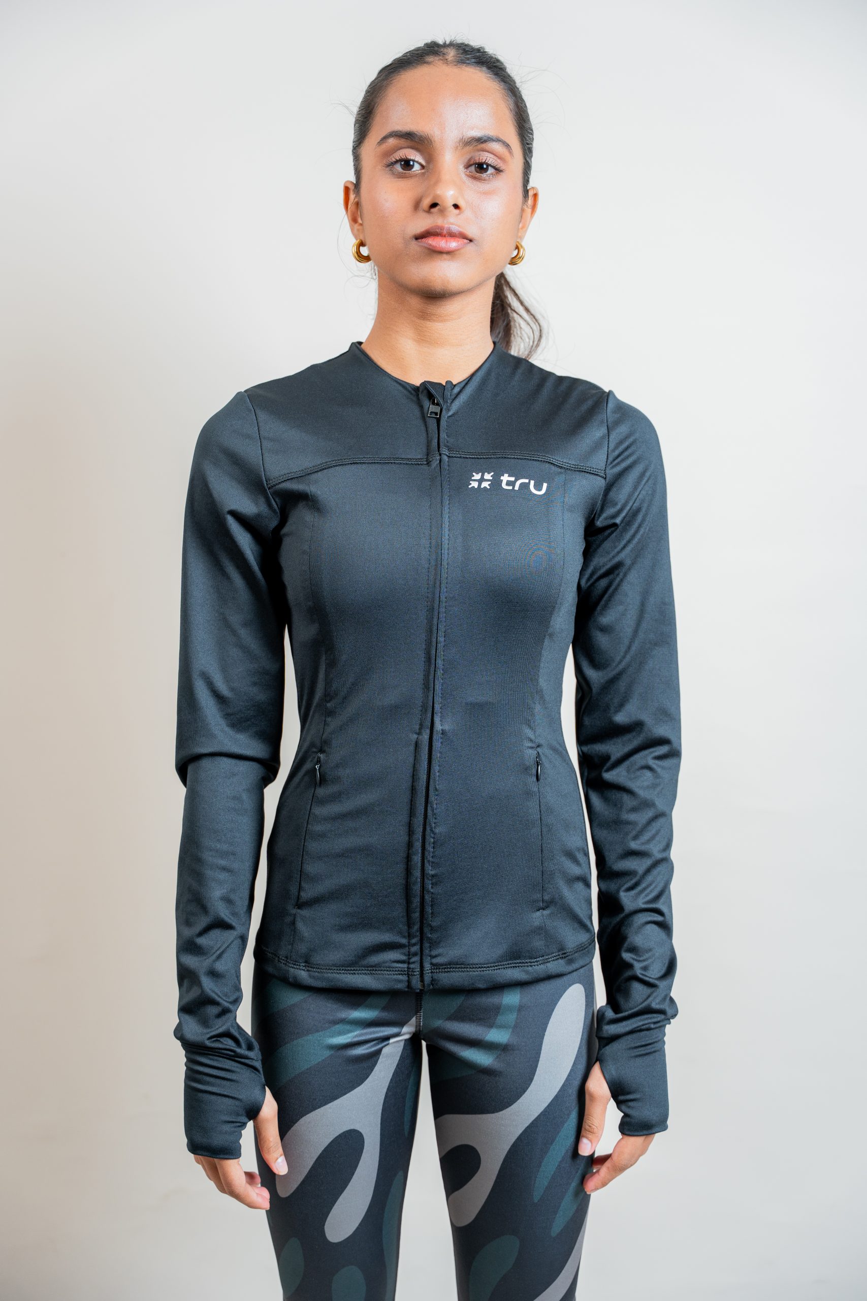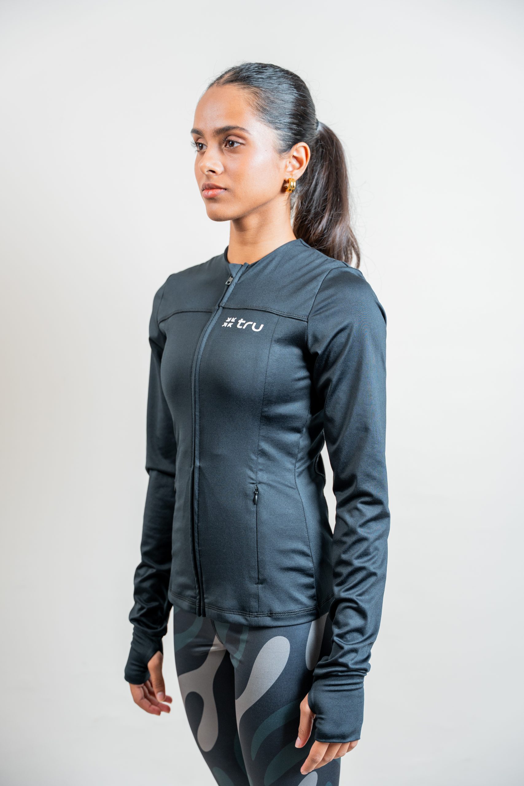 Move with confidence in our xip through jacket. Made from breathable, sustainable fabric, it offers a comfortable fit with a sleek silhouette. Designed for layering, its perfect for warming up, cooling down or everyday wear.